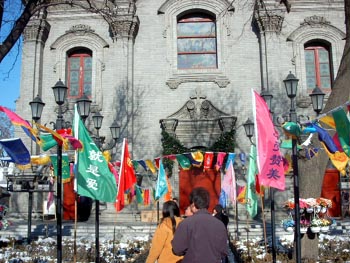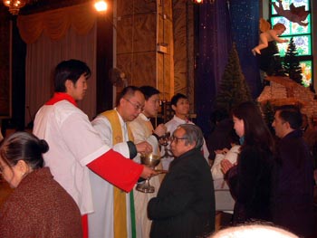 Die Kirche war voll mit Menschen, und die Messe wurde in englischer Sprache gehalten, deshalb konnte ich auch verstehen, was der Pfarrer in seiner Predigt erwähnte: Zur Mitternachtsmesse seien 42 000 Menschen anwesend gewesen, und zwar in der Kirche und auf dem dazugehörigen Grundstück und noch in einem weiten Umkreis auf der Straße. Es seien auch der Bürgermeister von Peking und wichtige buddhistische Vertreter der Stadt sowie andere erwähnenswerte Persönlichkeiten anwesend gewesen. Er sagte wirklich: 42 000 Besucher und bestätigte das später noch einmal auf unsere Anfrage. Gut zehn Prozent der Bevölkerung sollen Christen sein (Tendenz steigend). Üblicherweise werden die Meßfeiern aber in chinesischer Sprache gehalten, manchmal auch in lateinisch.