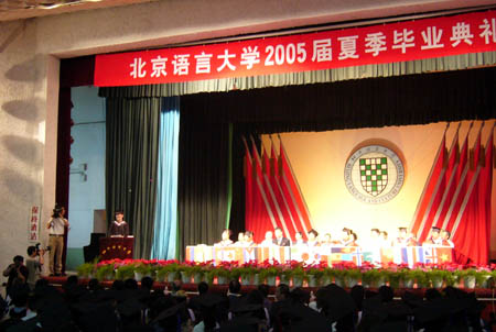 Bernhard (links am Rednerpult) während der Rede als Vertreter der ausländischen Studenten bei der Examensfeier in der BLCU