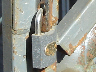 Der Aufgang zur Treppe ist auf der ersten Etage abgeschlossen und mit einem verrosteten Schloß gesichert. Es war also nicht möglich, die Treppe nach oben zu gehen.