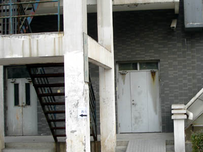 Das Gebäude hat außen an der Feuerschutztreppe auf jeder Etage zwei Türen. Im Erdgeschoß ist die Türe links - wie auf jeder Etage - mit einer Kette abgeschlossen. Die Tür rechts hat keine Kette. Die dort angebrachte Video-Kamera (rechts über der Tür, im Bild unten schwach erkennbar) ist nicht schwenkbar und geht auf den Bereich der Rampe.