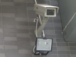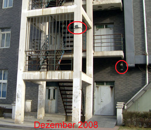 Nun wurde im Dezember 2008 der Ort erneut aufgesucht, und es wurde festgestellt, daß inzwischen, also im Laufe des Jahres 2008, zwei Lampen angebracht worden sind. Diese sind auf dem Bild unten rot eingekreist. Ein Scheinwerfer befindet sich jetzt an der Treppe und ein zweiter ist direkt unter der Kamera.
